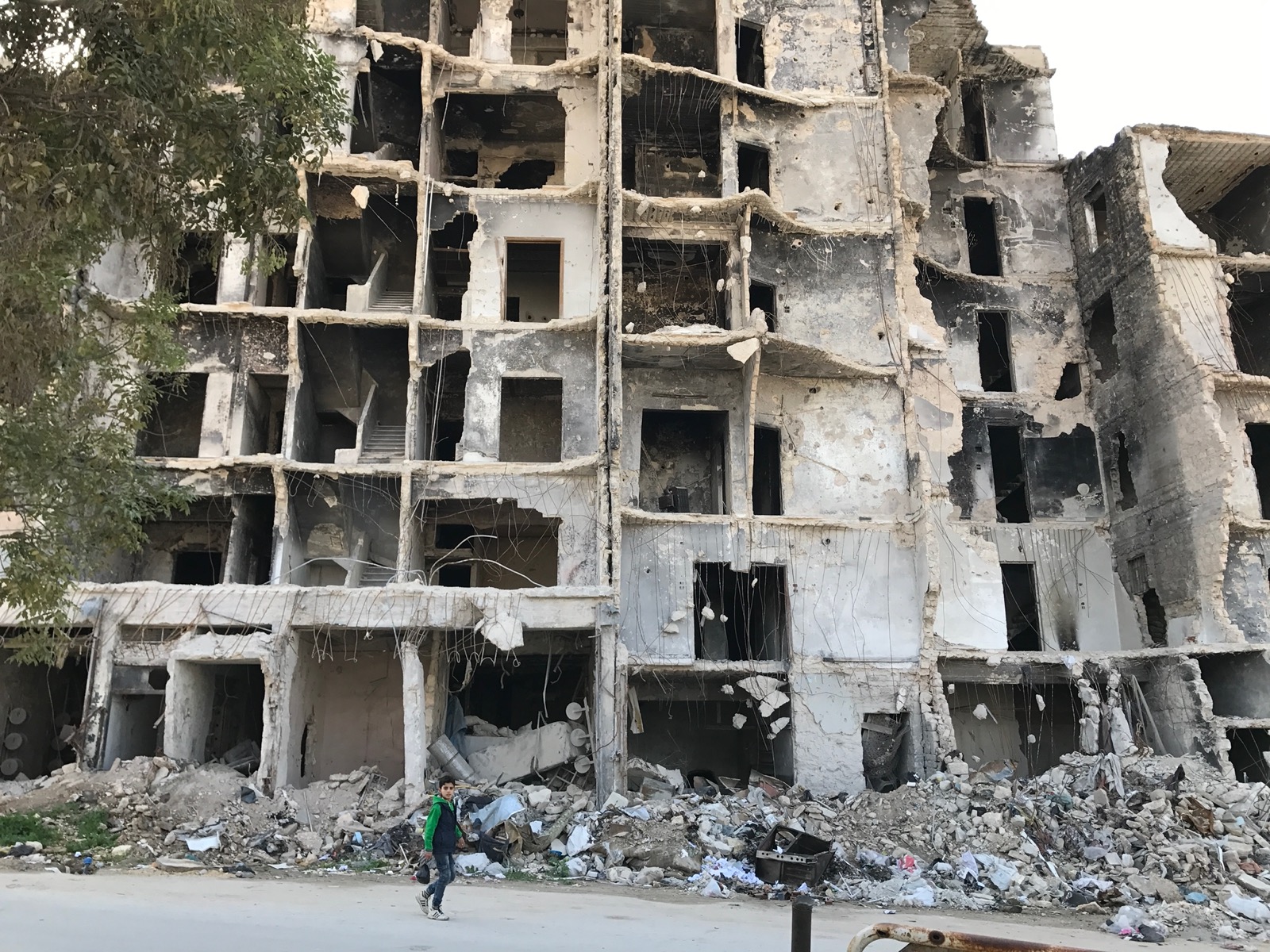─2016年、シリア最大の都市アレッポ。爆撃を受けて壁が吹き飛ばされた建物が並んでいます。骨組みだけになって形のゆがんだ集合住宅群が、まるで互いを支え合うようになんとか建っています。道端には瓦礫が高く積まれ、コンクリートを補強していたはずの鉄筋は、毛糸のように丸められて脇に寄せられています。家々の窓にガラスはなく、窓であったところは暗い虚空になっているか、ビニールシートで覆われています。度重なる武力衝突で破壊され、風景から色が失われ、家々も、道路も、すべてが灰色に変わってしまった街。それがアレッポでした。そんな廃墟と化した街で、少し足を引きずるようにして歩くひとりの女の子に出会いました。