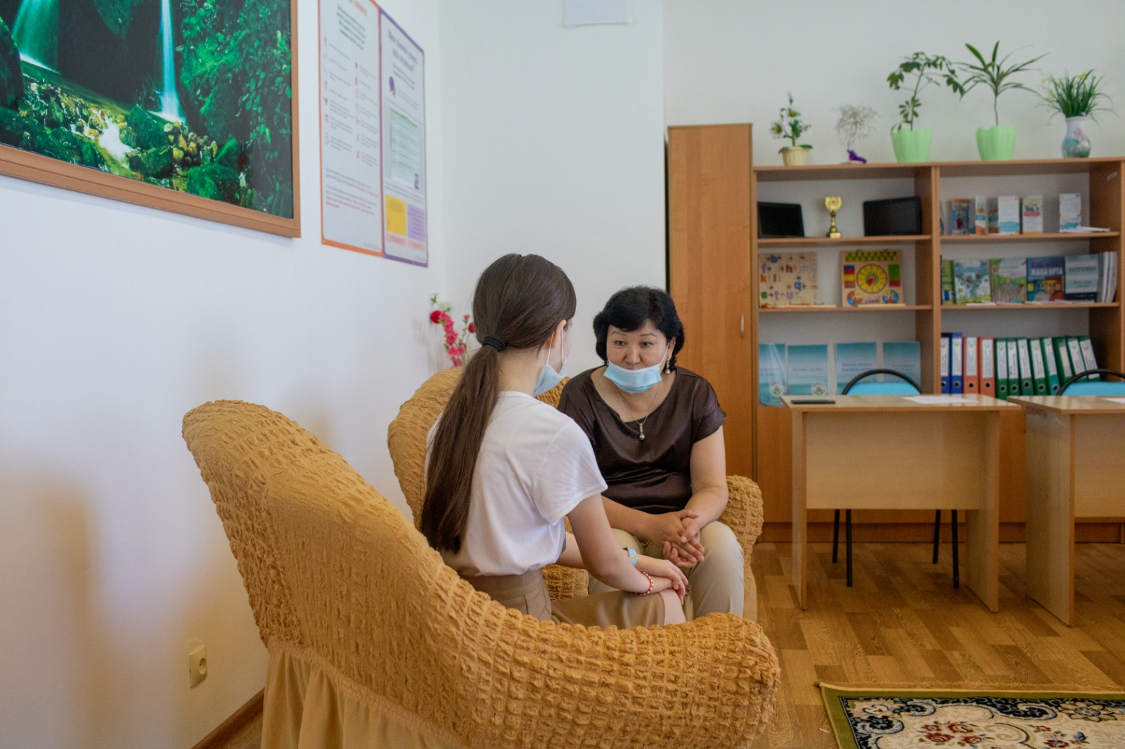 2012年以降、カザフスタン政府は、ユニセフやパートナー団体とともに、学校を基盤としたメンタルヘルスの普及啓発と自殺予防を目的としたプログラム「若者のメンタルヘルスと自殺予防プログラム」を立ち上げました。同プログラムのアンケート調査で強い不安とストレスの兆候が見られたディナさんは、カウンセリングを受けるよう勧められました。心理カウンセラーのセイトハノヴァさんは、「ディナさんは家族関係に問題を抱えていました。彼女とは最初の2カ月間は週1回、その後は月2回のカウンセリングを続けています」と振り返ります。