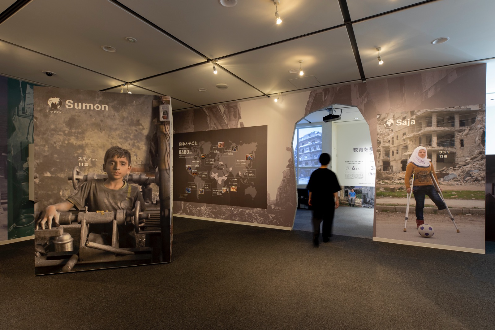 2階のゾーン2では、「栄養」「児童労働」「児童婚」「移民・難民」「子ども兵士」「紛争」「教育」などの社会課題の影響を受ける実在する子どもたちの状況を、7つのブースで伝えています。